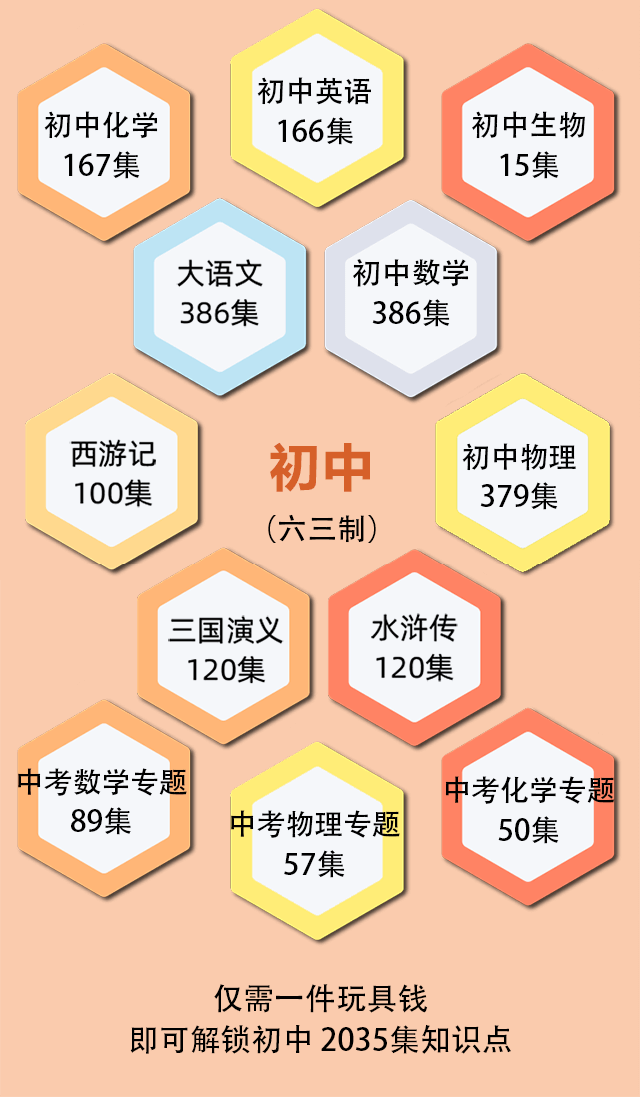 初中科目有名著西游三国水浒,大语文、同步课程的数学、物理、化学、英语、生物,以及中考课程数学、物理、化学等内容。