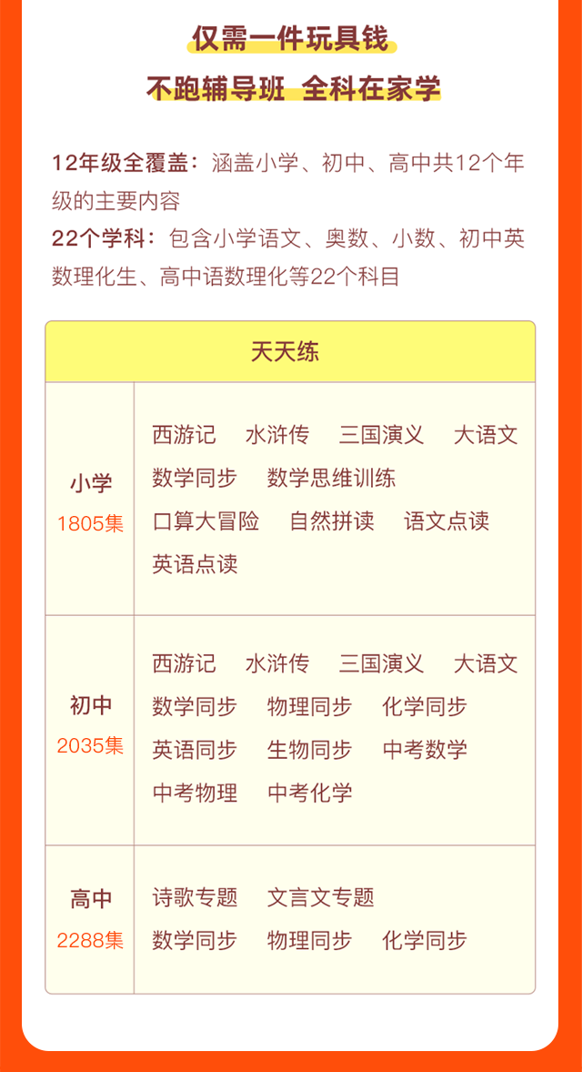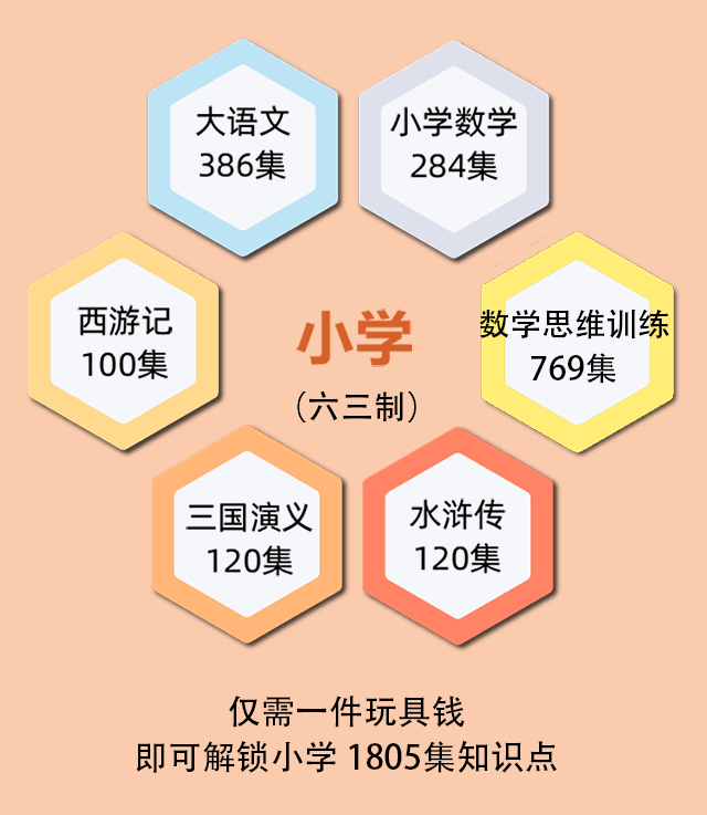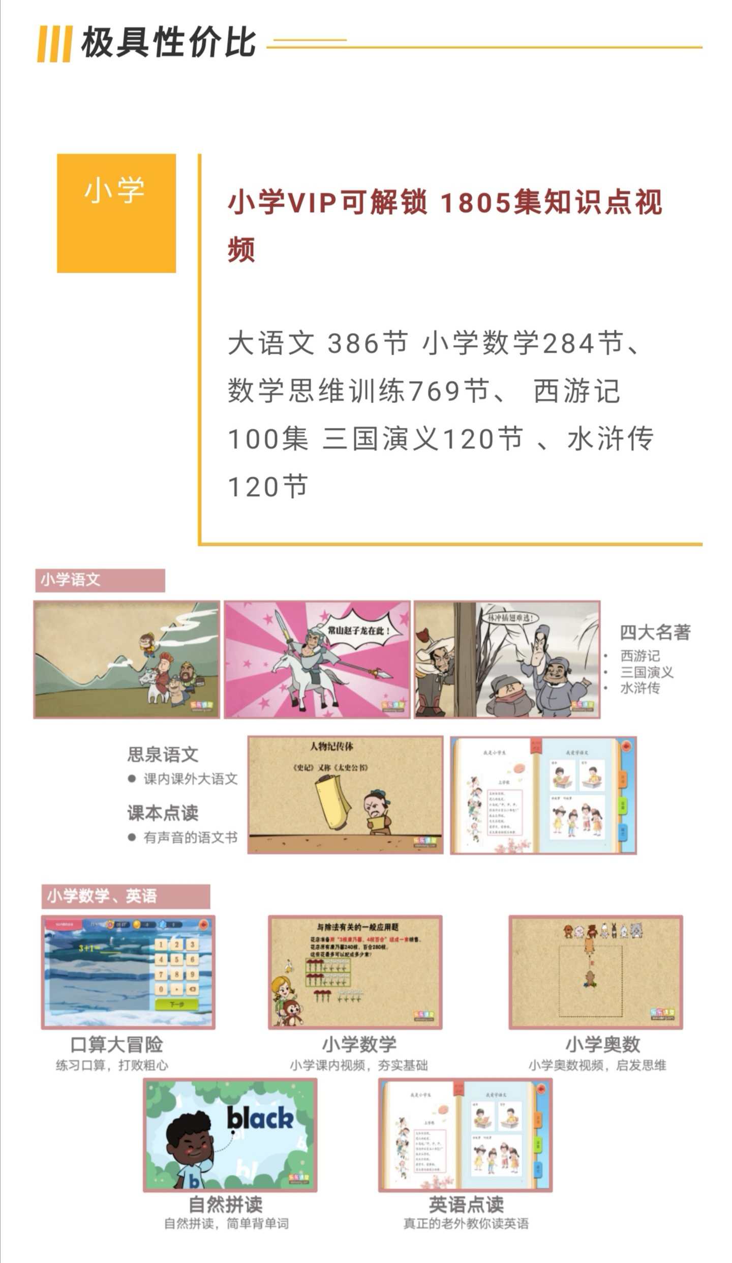 小学科目有名著西游三国水浒、大语文、口算大冒险、思维训练、自然拼读、语文点读、英语点读,以及同步课程的小学数学内容。