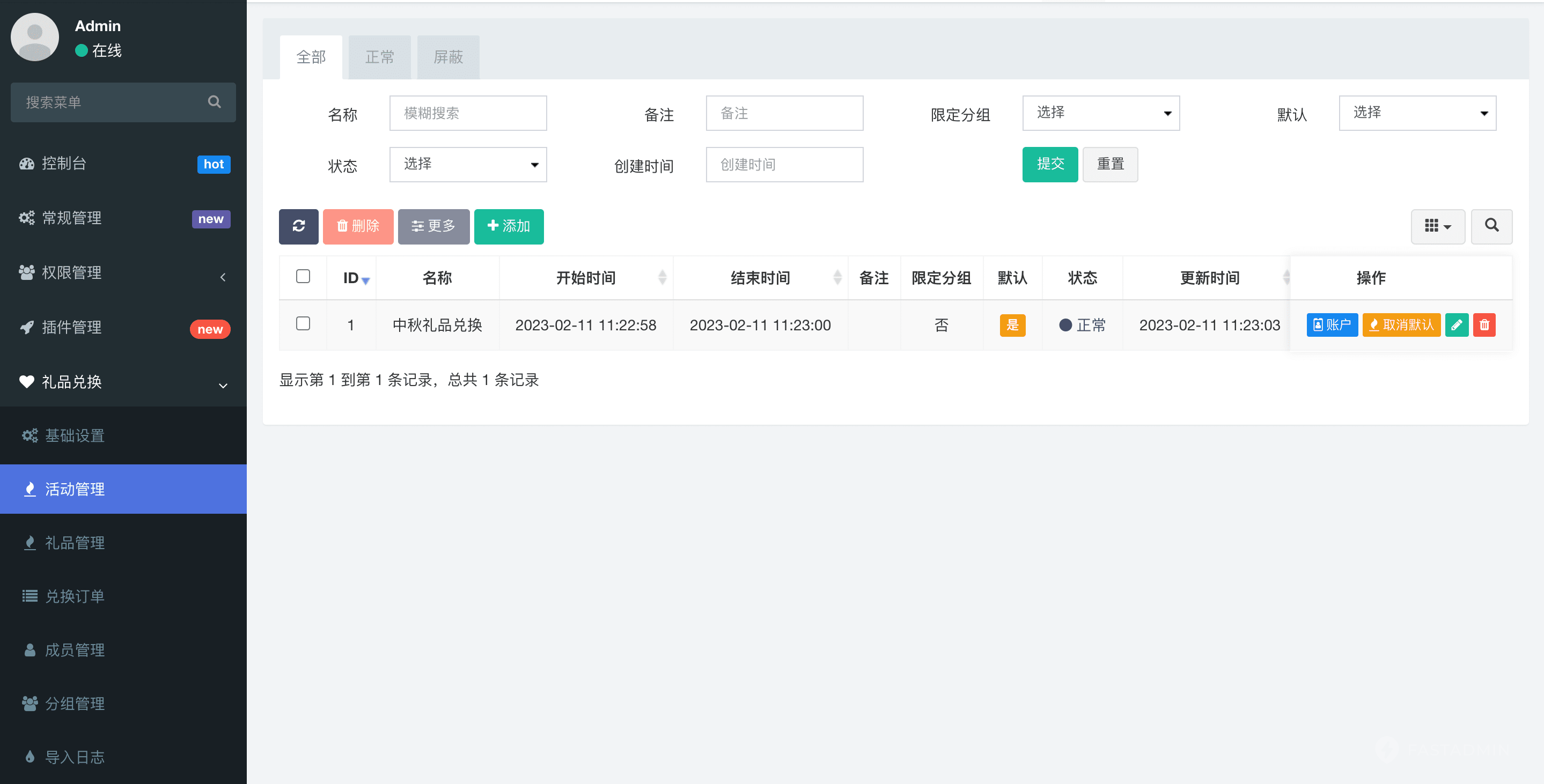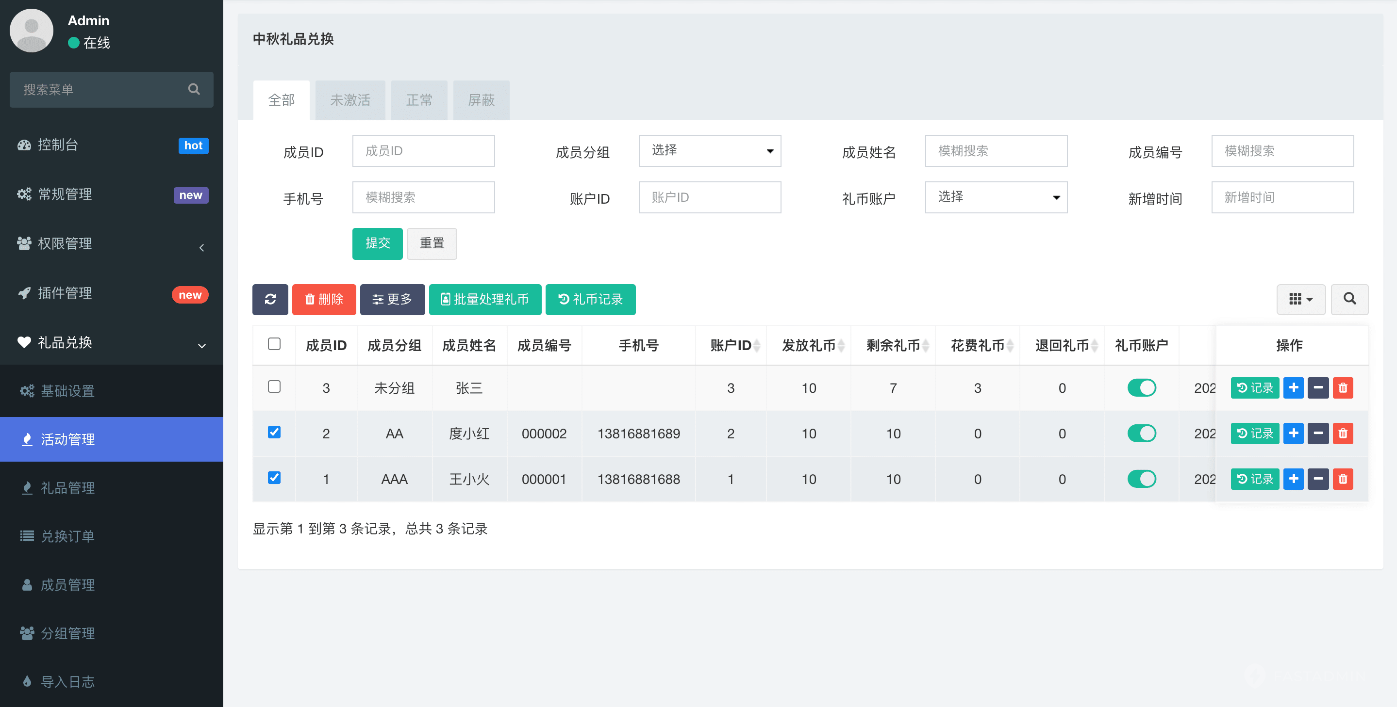 在活动下可以快速激活礼币账户,并发放初始礼币数量,也可以批量增减礼币数量,会产生详细的礼币记录