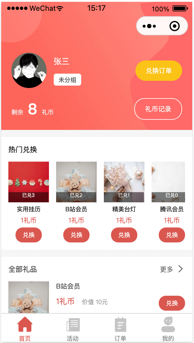 给每个活动下的用户都分配一个礼币账户,使用这个账户里的礼币进行礼品兑换,灵活性强,礼币使用记录可追溯
